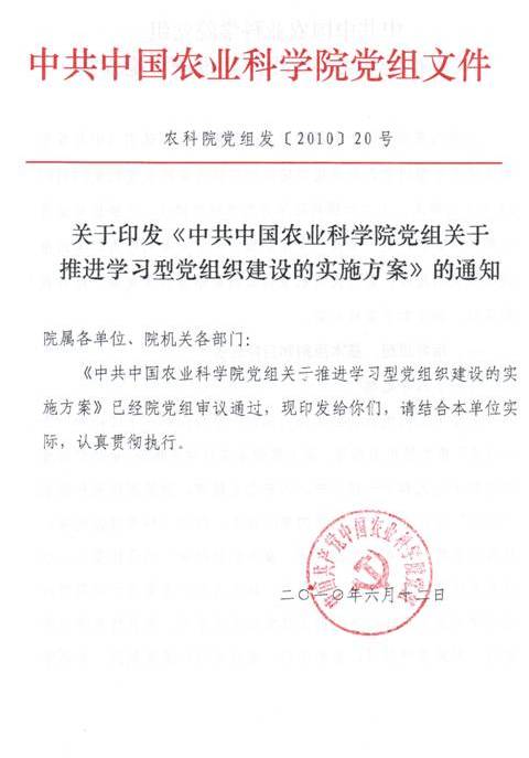 关于印发《中共中国农业科学院党组关于推进学习型党组织建设的实施方案》的通知